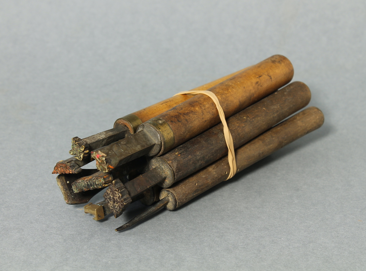 Eight hand tools including ‘HOLY BIBLE’ and a crucifix.