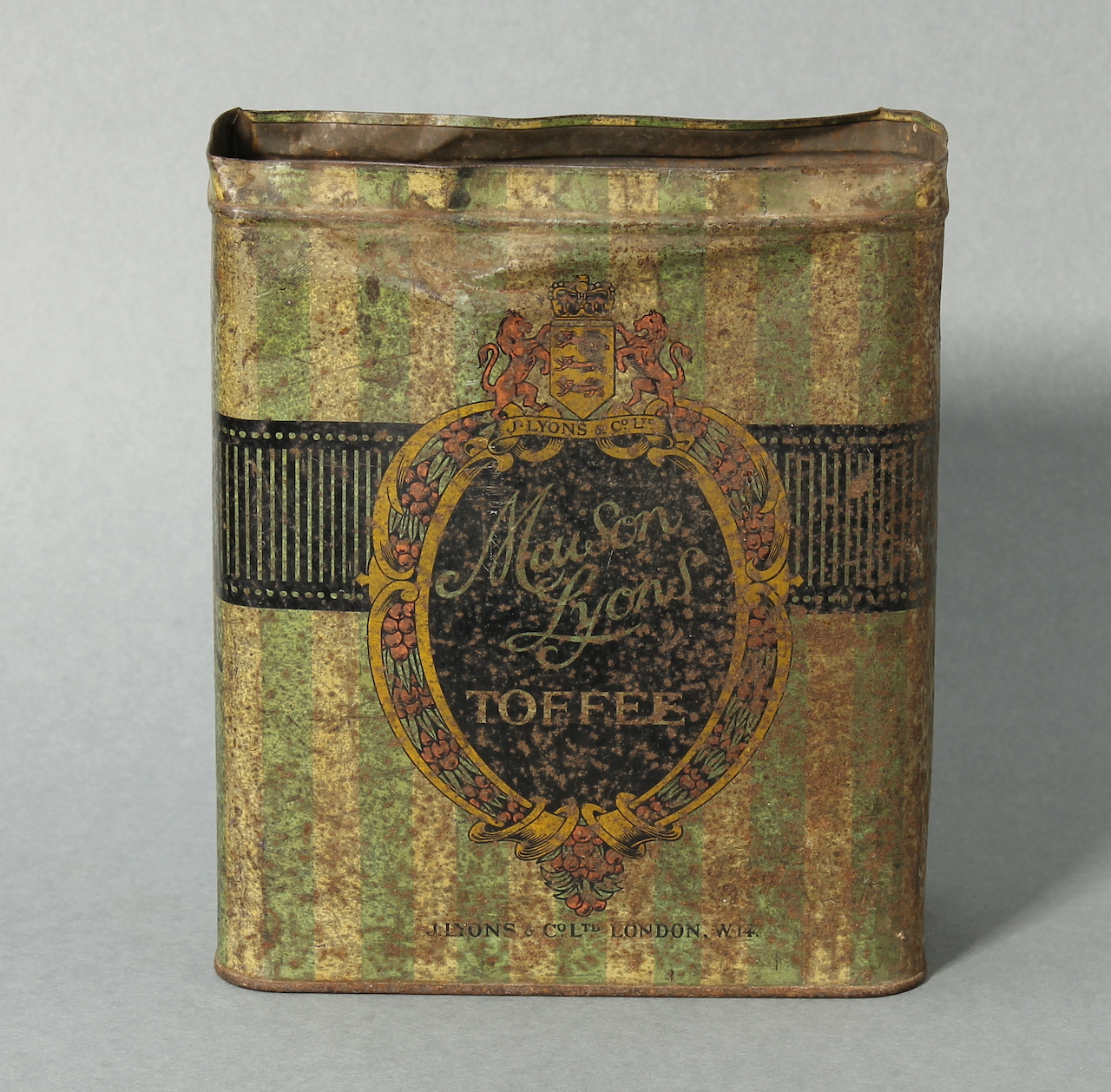 All 26 letters (mismatched smaller ‘o’ from a different set) and numbers (6/9 missing); stored in a Lyons Toffee tin.